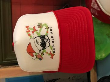 Red Hats with White Front Foam Mesh Trucker Hats with multi-color transfer on front, artwork provided.