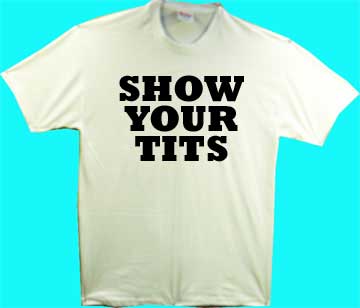 you remember "Shut Up, Bitch", well this is the English equivalent to crass and rude. The classic "Show Your Tits" design is one of England's finest calls to masculine behavior in public. When worn on a beer belly this shirt becomes a cry for help, "Stripper Please!" Anyway just remember you can only find it here, unless you fly to England.